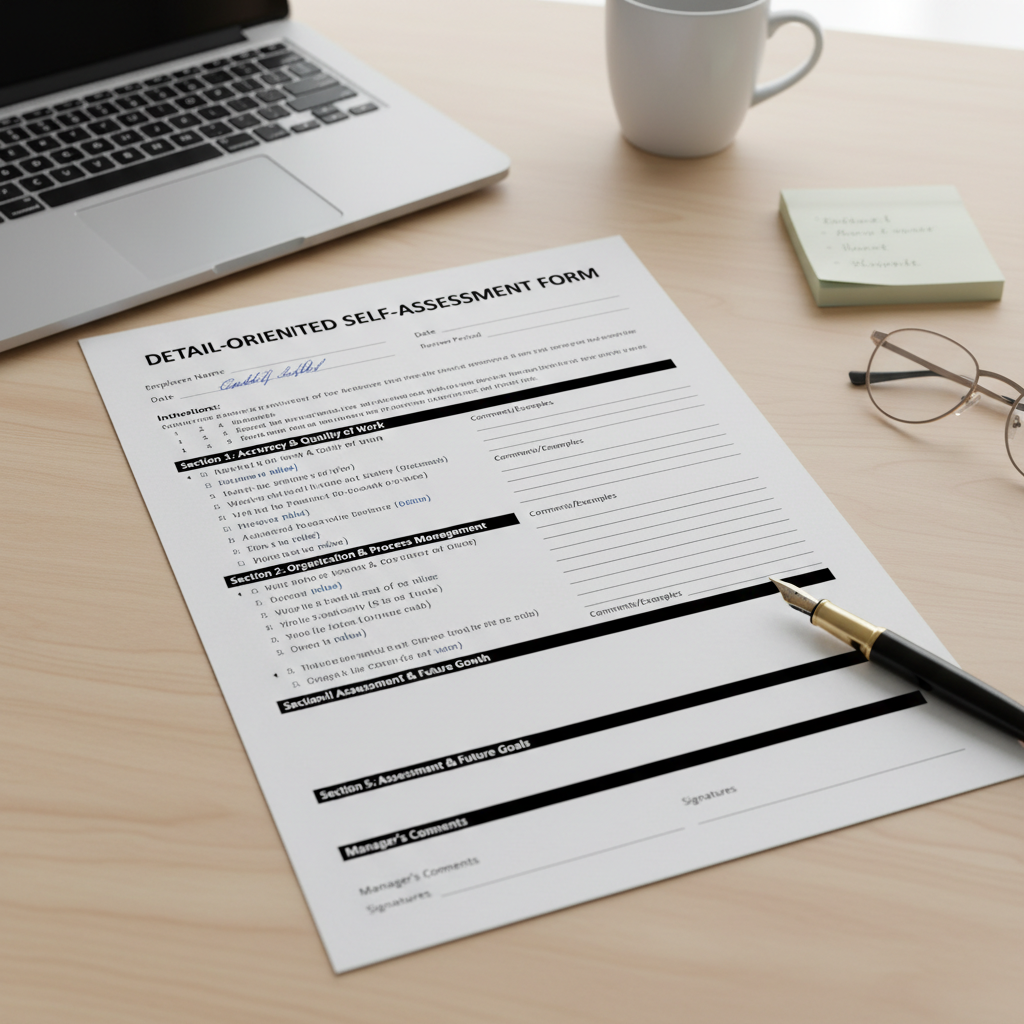 Alt: Person thoughtfully evaluating their own attention to detail on a self-assessment form