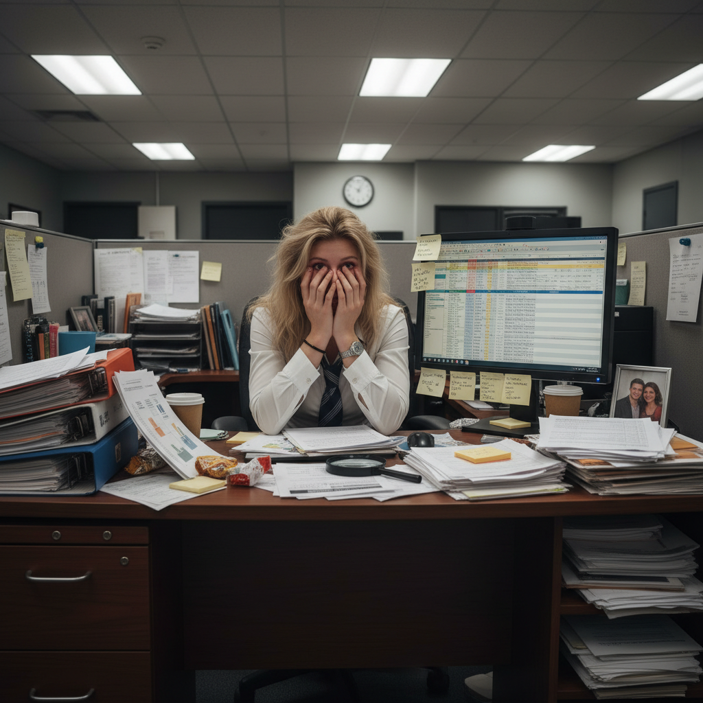 Alt: Overwhelmed office worker buried in details at a cluttered desk, representing burnout from excessive attention to detail
