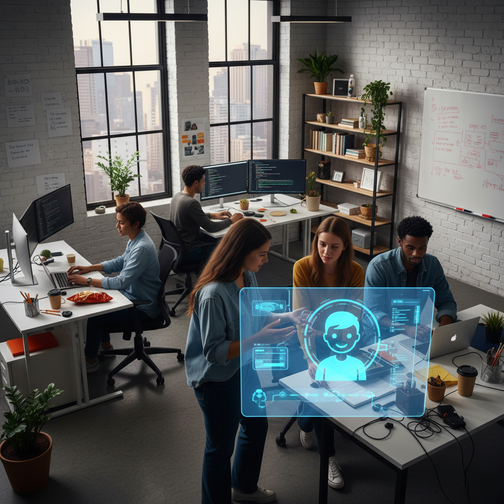 Startup team working with AI assistant in small office, digital business assistant in action