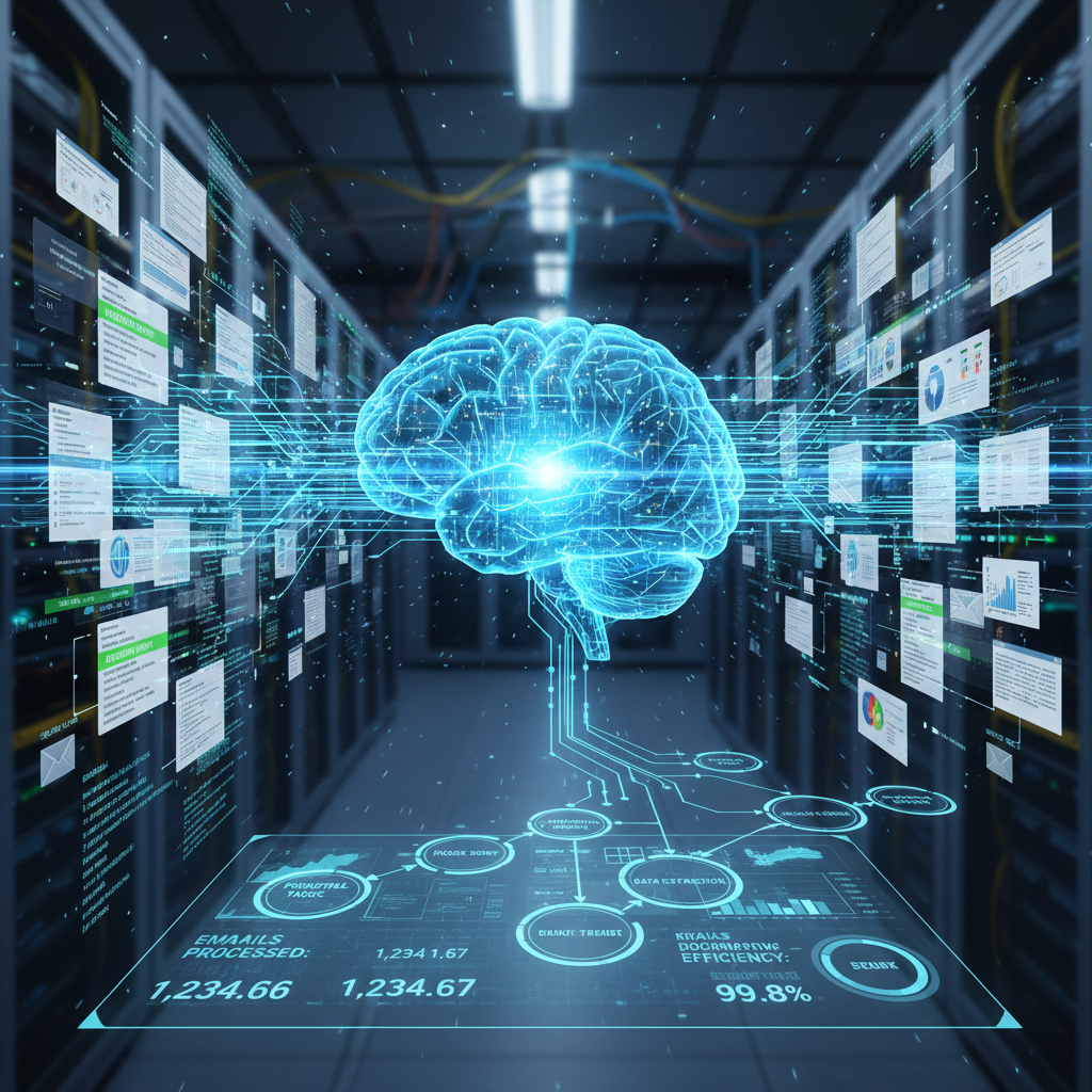 Alt text: AI-powered digital brain illustration analyzing business emails and documents, keywords: document supporter, workflow automation, enterprise AI