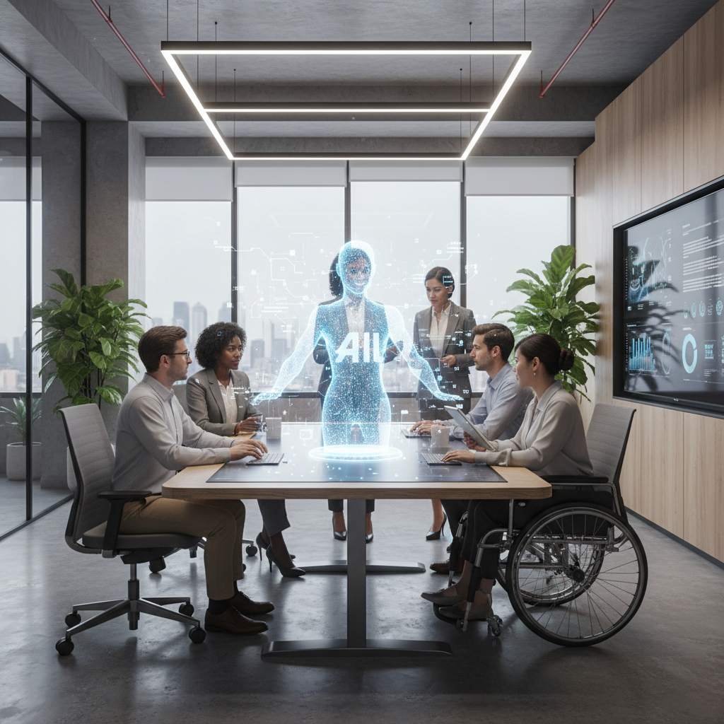 Alt text: Diverse business team collaborating with a virtual AI teammate in a modern office, keywords: document supporter, digital transformation, enterprise teamwork