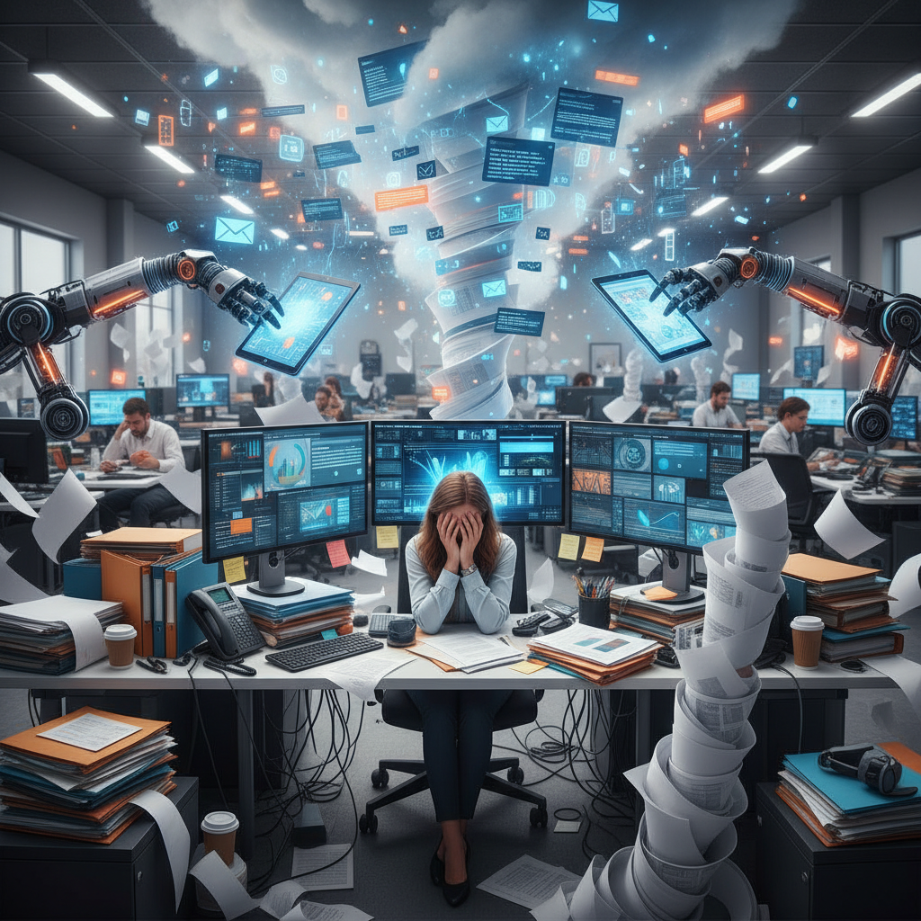 Alt text: Overwhelmed employee at a chaotic desk, surrounded by paper stacks and floating email icons, keywords: document supporter, digital workflow overload