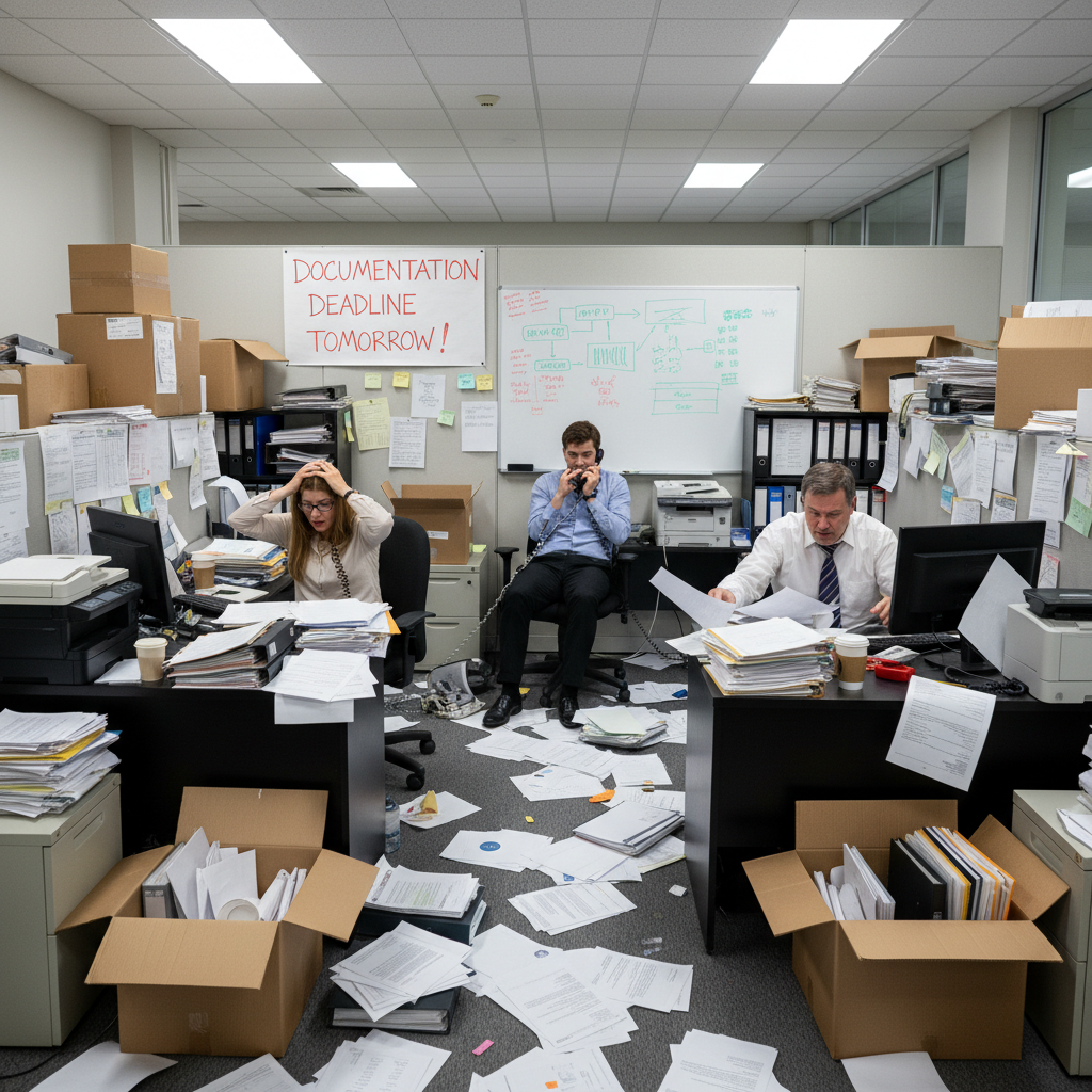 Alt text: Stressed team overwhelmed by failed documentation creation in chaotic office environment, relevant to documentation creation.