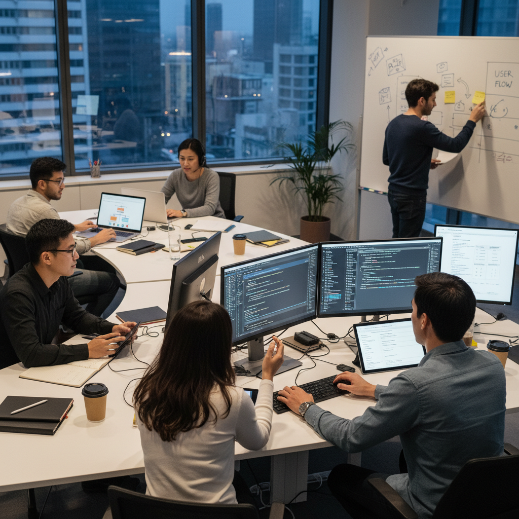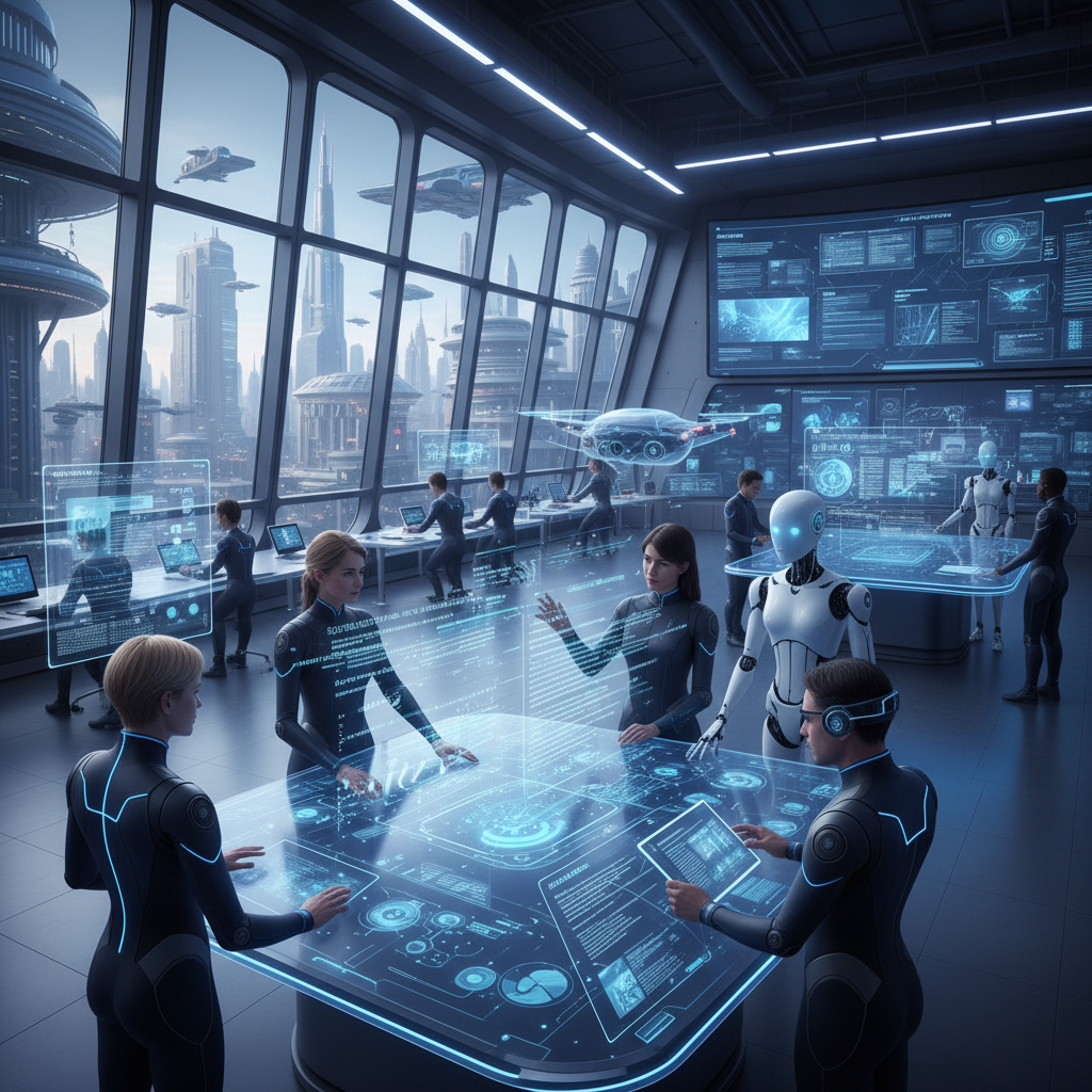 Alt text: Futuristic office showcasing humans and AI working together on documentation creation.