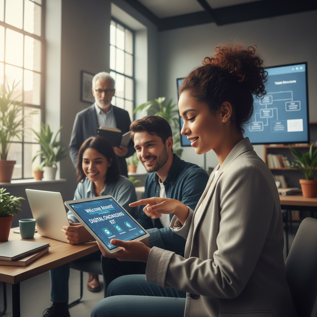 Alt text: New employee being welcomed by team using digital documentation creation during onboarding.