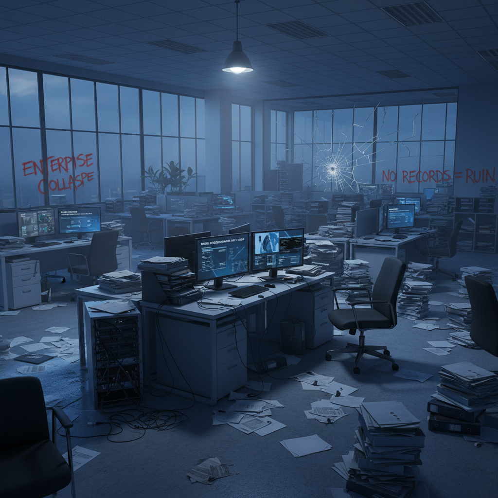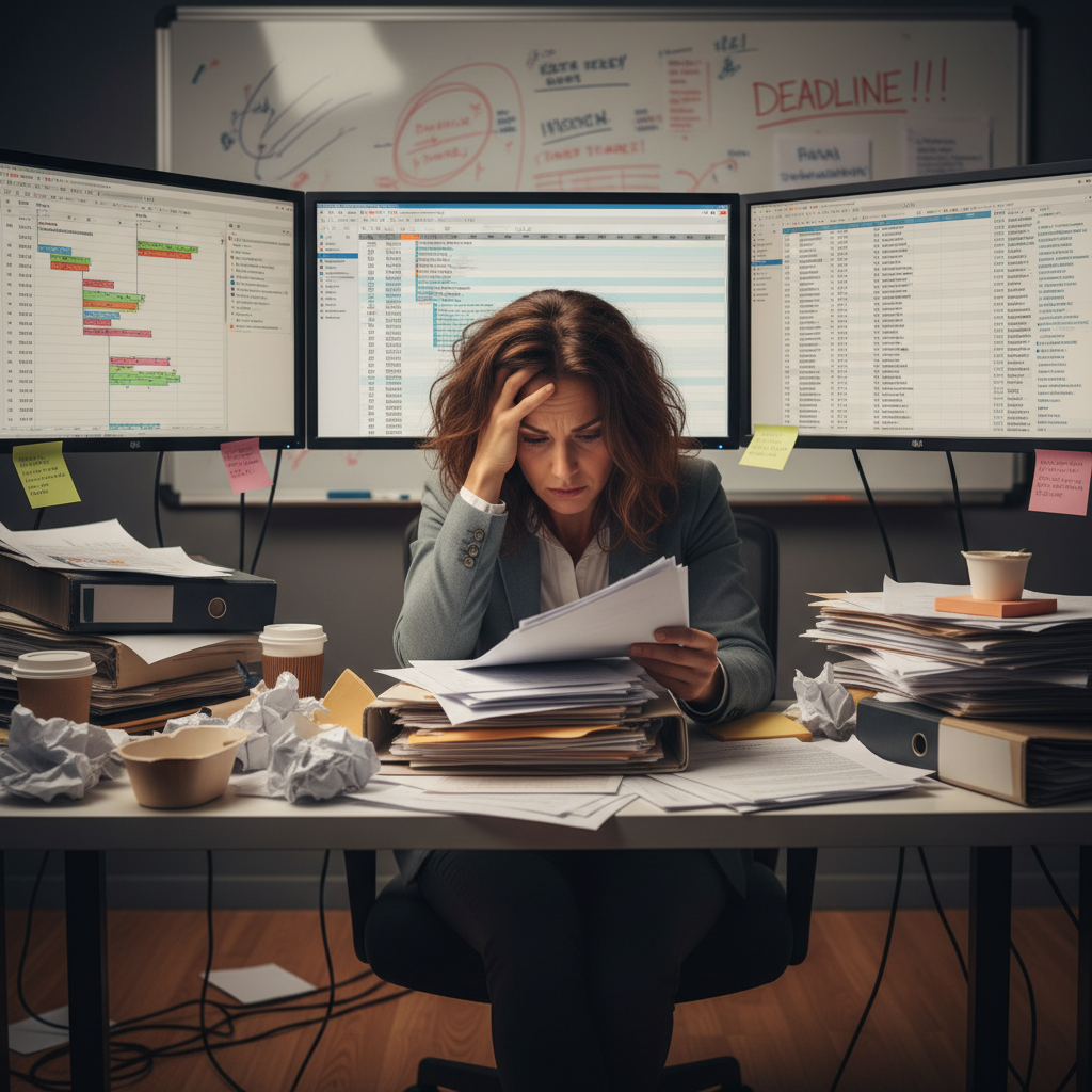 Alt text: Stressed project manager surrounded by paperwork and digital screens, overwhelmed by poor documentation in an enterprise setting.