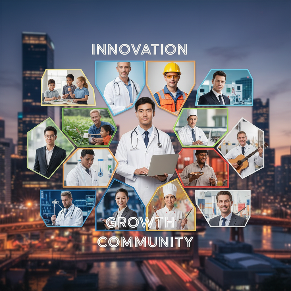 Collage of professionals from different industries collaborating against an urban backdrop, highlighting cross-industry lessons for innovative economical support.