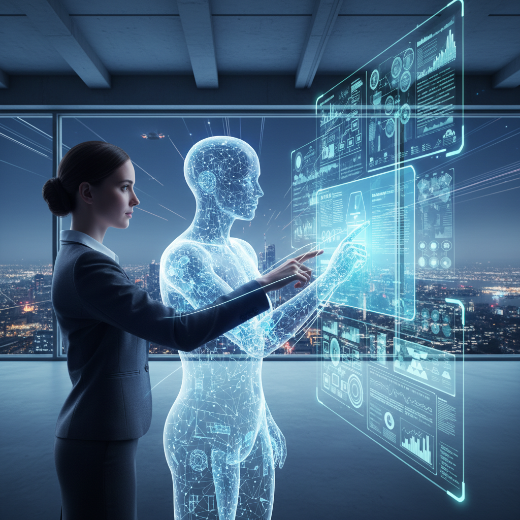 Futuristic office with digital overlays and AI assistant icons, illustrating AI reshaping the dynamics of enterprise support.