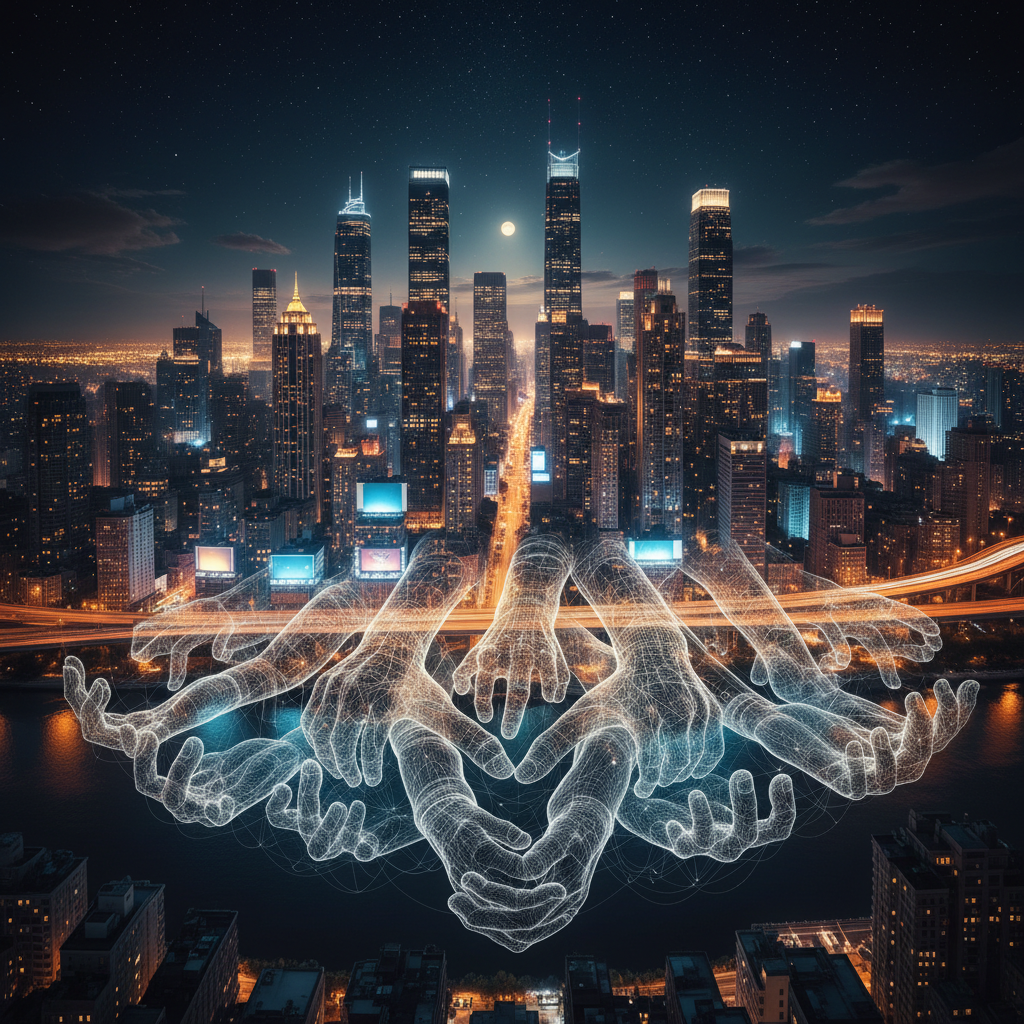 Night city skyline with lights forming a pattern of interconnected hands, symbolizing enterprise support lighting up the future and the promise of bold, economical support.