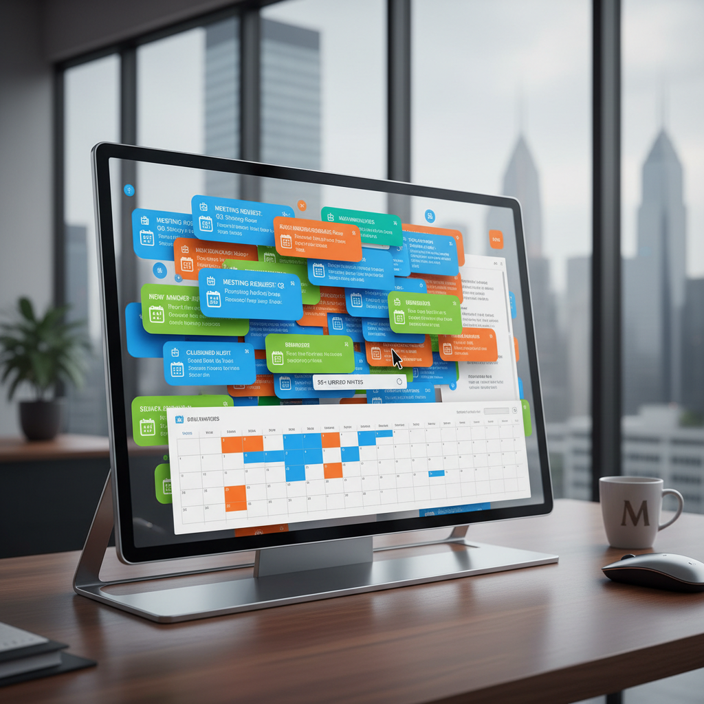 Alt: Overflowing email inbox with scheduling notifications in a modern corporate office, visualizing the chaos of manual scheduling.