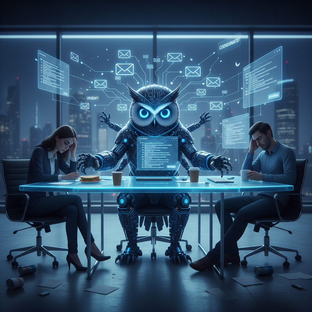 Alt: AI-powered email coworker organizing inbox chaos for stressed team members and boosting productivity.