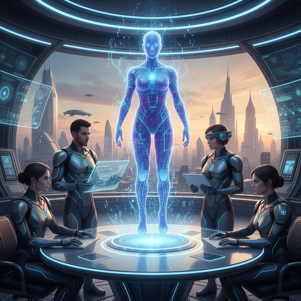 Alt text: Futuristic office team collaborating with AI-powered email assistant, highlighting advanced online email collaboration