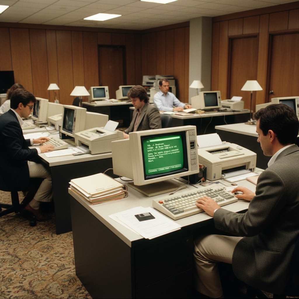 Alt text: Early email collaboration in workplace with retro computers and business professionals, illustrating the rise of email culture
