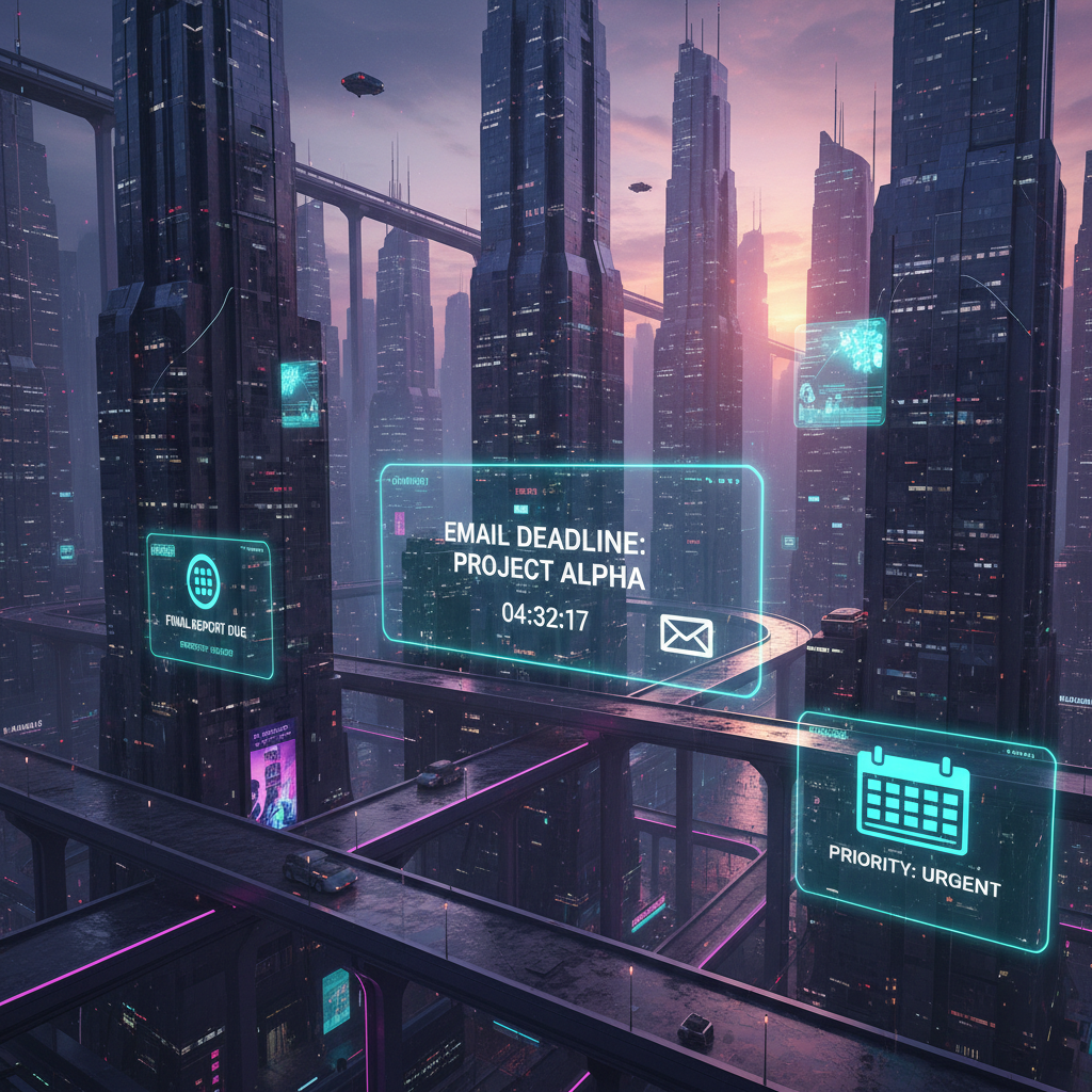 Alt text: Moody photo of futuristic cityscape with digital reminders floating above skyscrapers, representing evolution of email deadline reminders