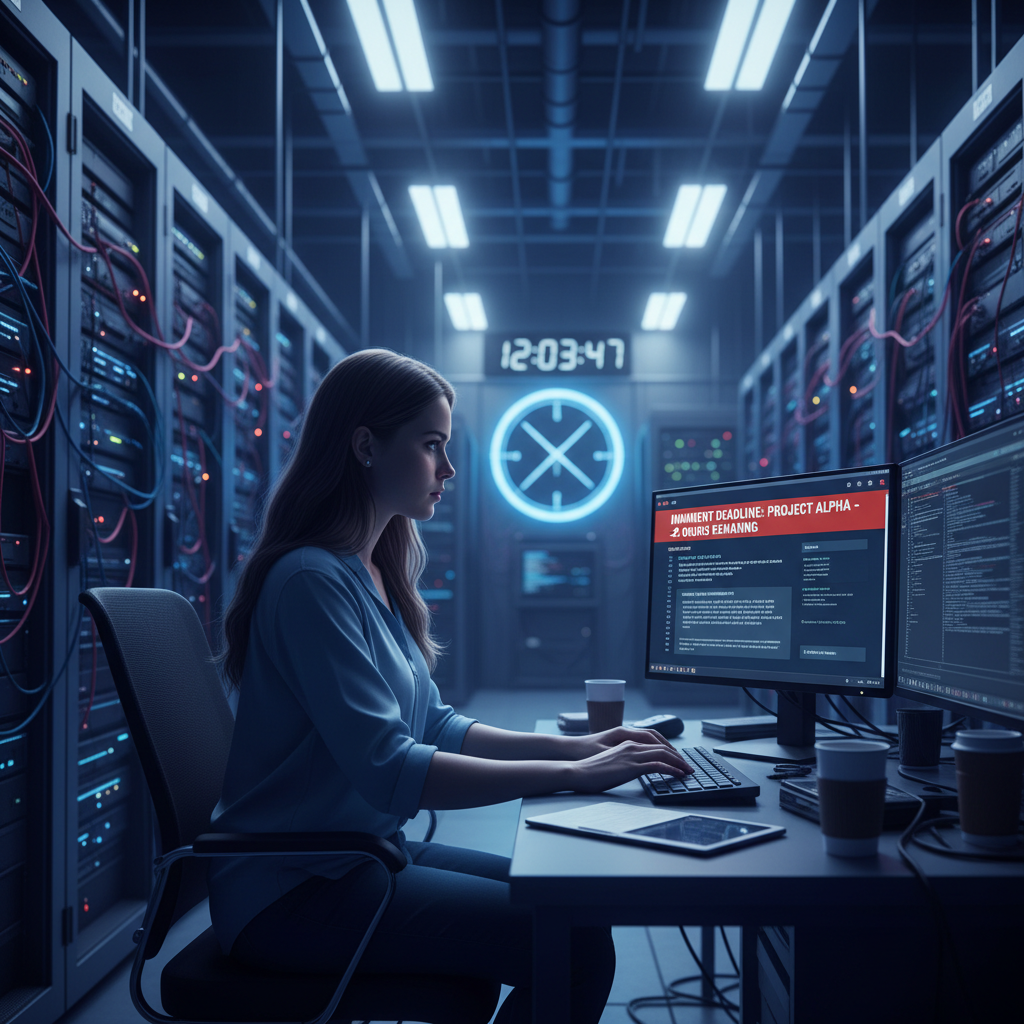 Alt text: Photo of server racks blending into digital email inbox, symbolizing backend mechanics of email deadline reminders