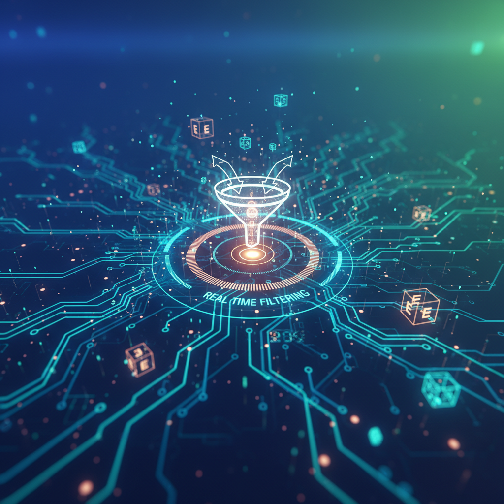 Alt text: Abstract photo showing AI processing email data streams in real time for email filtering.