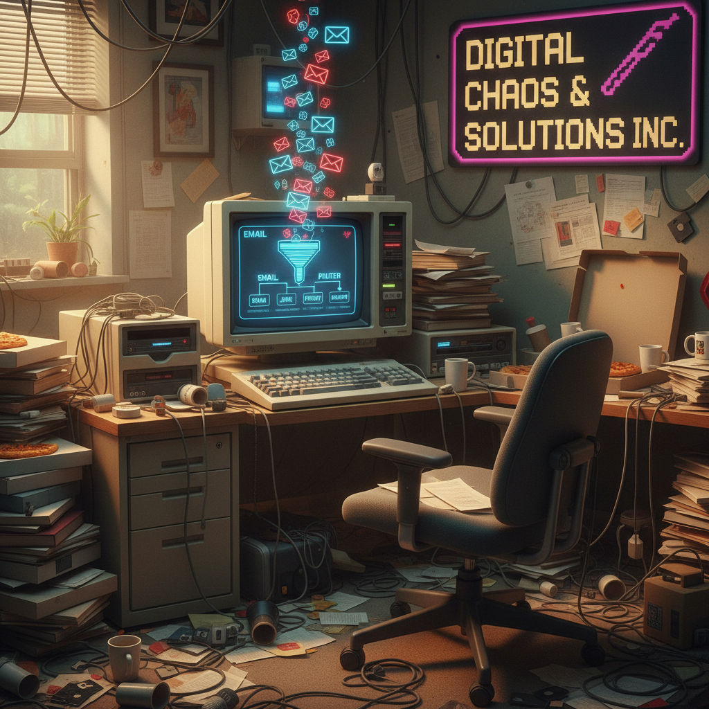 Alt text: Early email spam chaos with retro computer, digital envelopes, and email filter concept in a 1990s office.