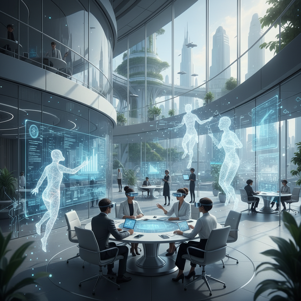 A futuristic workspace scene where AI avatars and humans collaborate seamlessly, reflecting the future of digital coworkers and intelligent email insights.