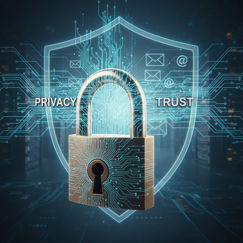 Photo of a strong padlock set against a stream of digital email icons, reflecting the privacy and trust challenges of AI-driven email insights.