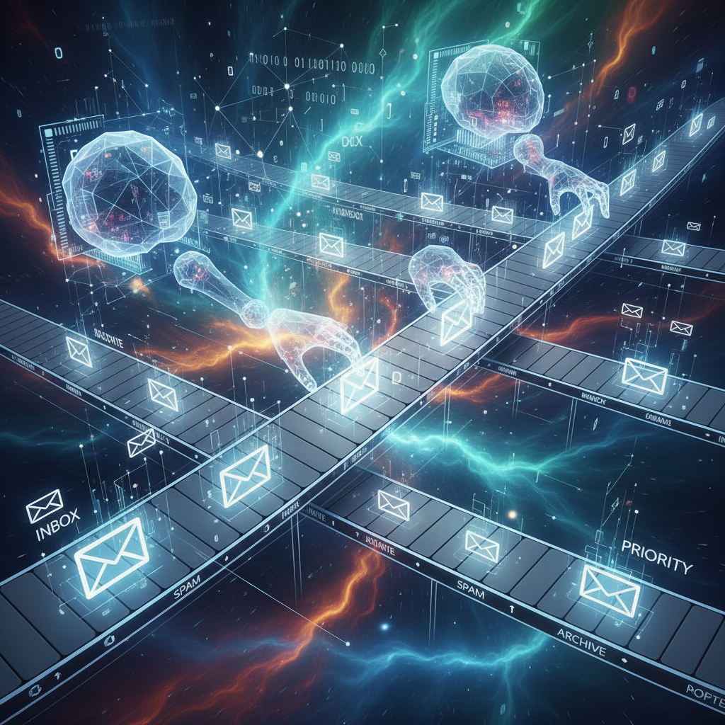 Alt: Abstract visualization of AI algorithms sorting and prioritizing emails, symbolizing improved email management productivity