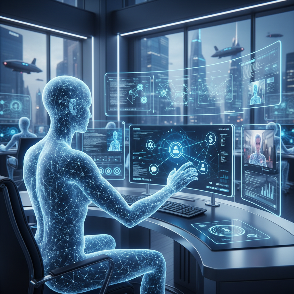 Alt: Sleek AI-powered coworker visualized at digital workstations, collaborating with humans in a modern office