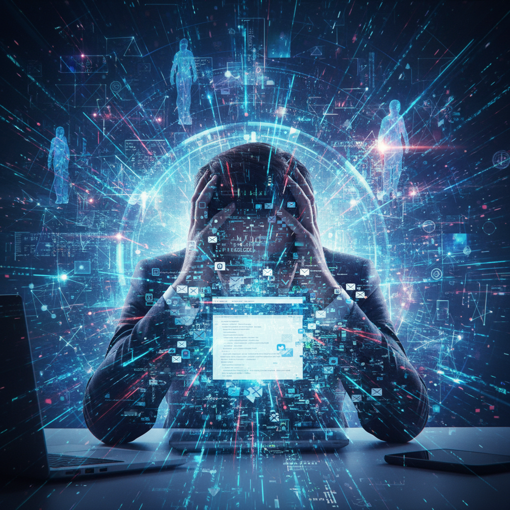 Alt: Overwhelmed office worker staring at overflowing email inbox with digital glitch effects and AI motifs, illustrating email overload productivity crisis