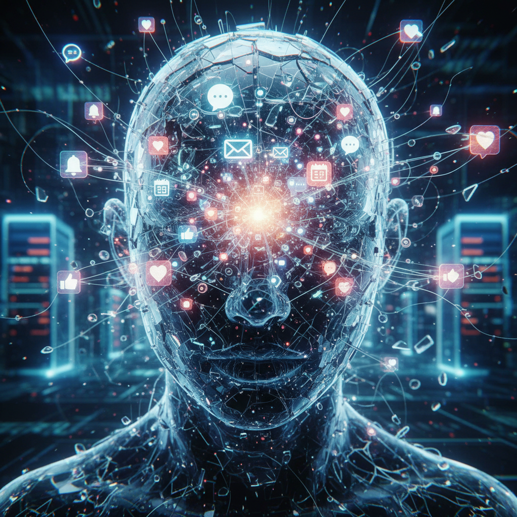 Alt: Surreal split-screen showing a worker’s mind fragmented by email notification icons, symbolizing cognitive overload