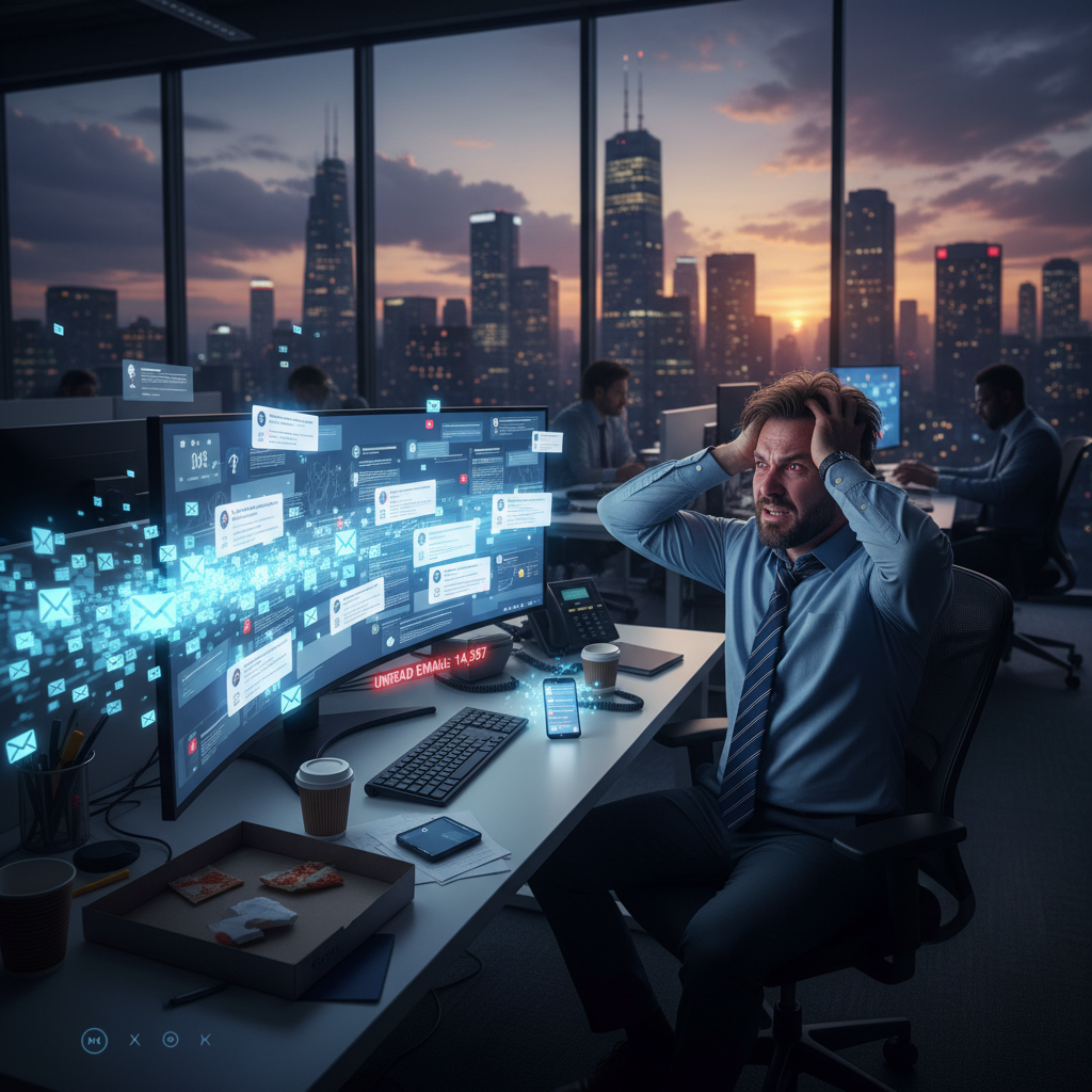 Alt: Stressed professional surrounded by email notifications and digital clutter, representing email overload and productivity loss.