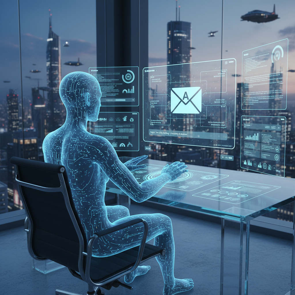 Alt: Futuristic photo of an AI avatar assisting a knowledge worker at a digital workstation, symbolizing an AI teammate collaborating on email tasks.