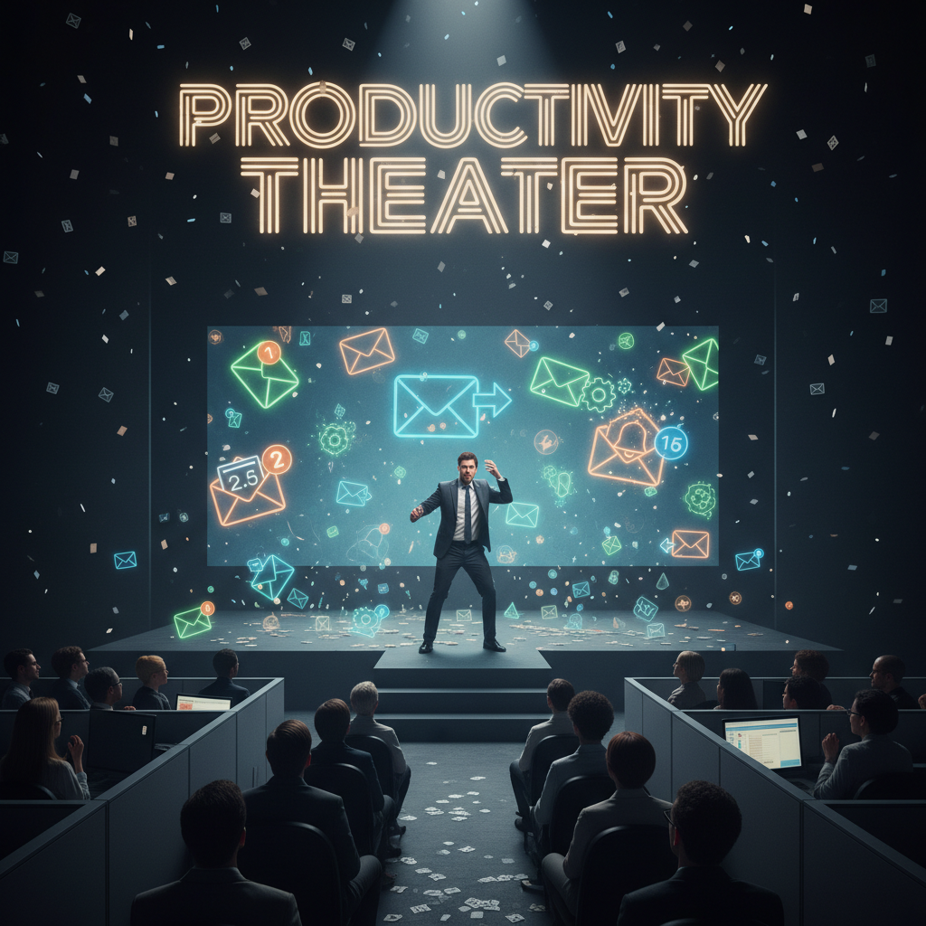 Alt: Edgy photo of an office worker performing on a stage of email icons, representing productivity theater tied to email management.