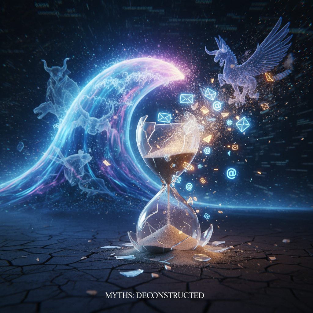 Alt: Photo of a shattered hourglass among email icons, symbolizing breaking persistent email productivity myths.
