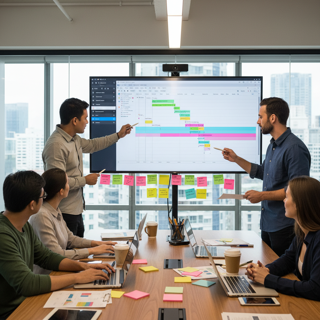 Team collaborating on digital project plan during software rollout