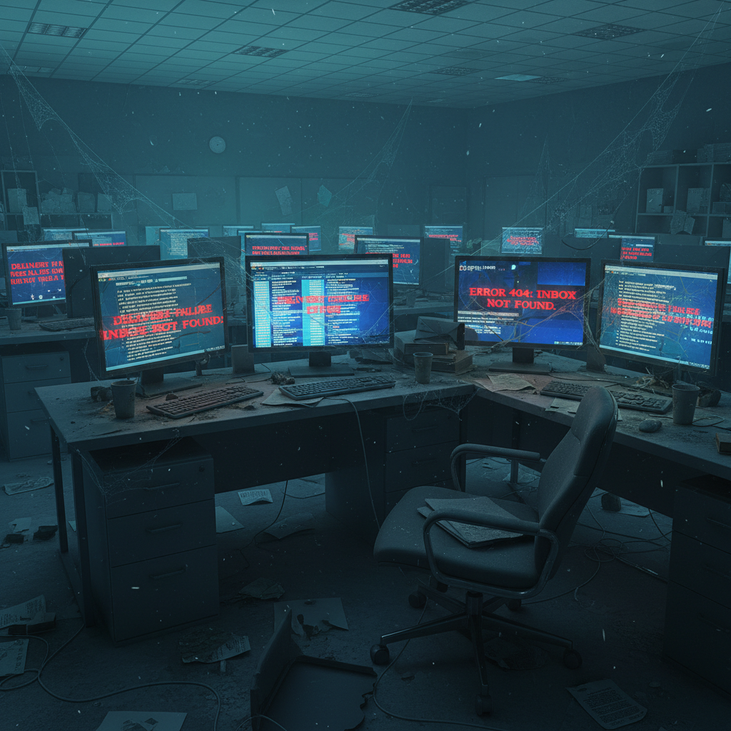 Abandoned office with glowing screens displaying error messages and overflowing inboxes, symbolizing the failure of poorly implemented email productivity software enterprise app.
