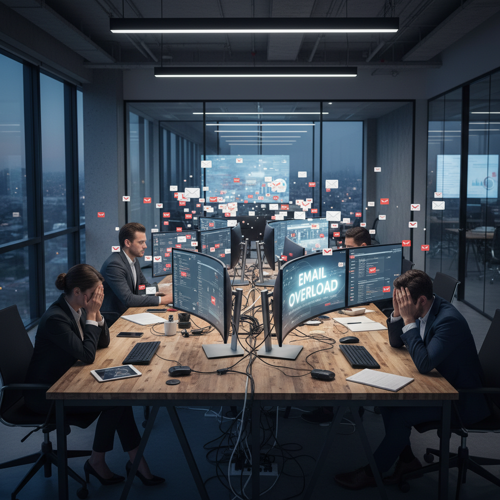 Enterprise team surrounded by overflowing inboxes and email notifications in a modern office, highlighting challenges with email productivity software enterprise app adoption.