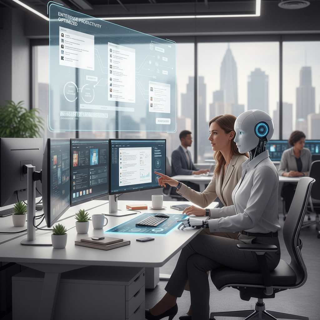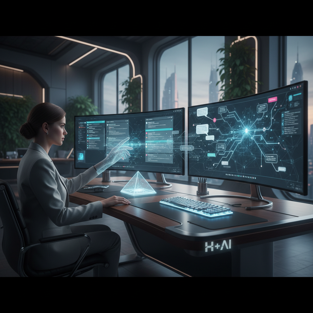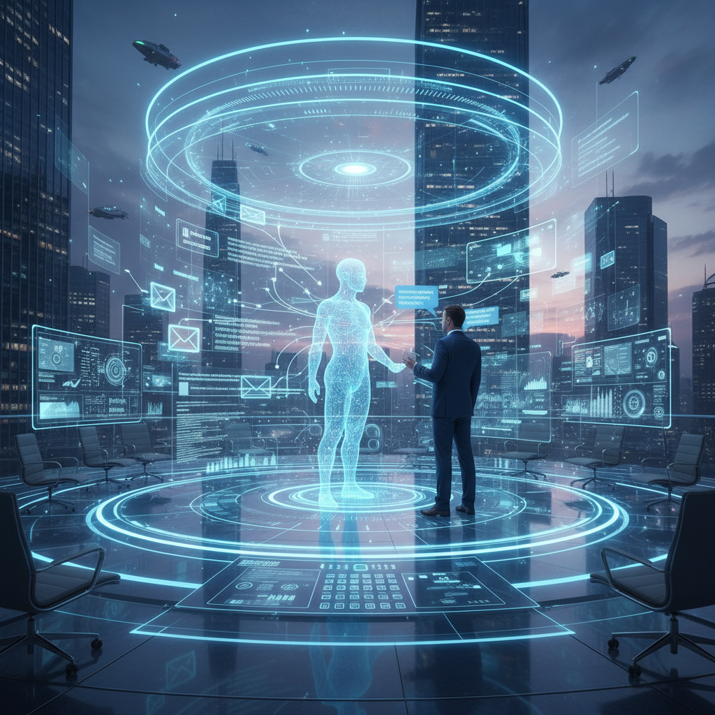 Futuristic workspace where human and AI digital coworkers collaborate in a holographic environment blending email, chat, and real-time data streams, exemplifying the next evolution of enterprise productivity software.