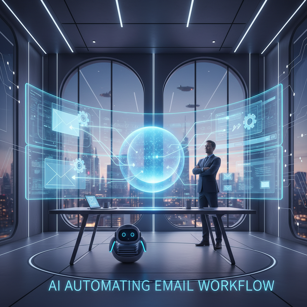 Image: Surreal concept art of an office where emails sort themselves. Alt text: AI automating enterprise email workflow.