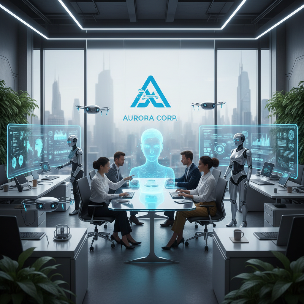 Image: Futuristic workspace with AI hologram collaborating with human team. Alt text: AI-powered virtual teammate assisting enterprise workers.