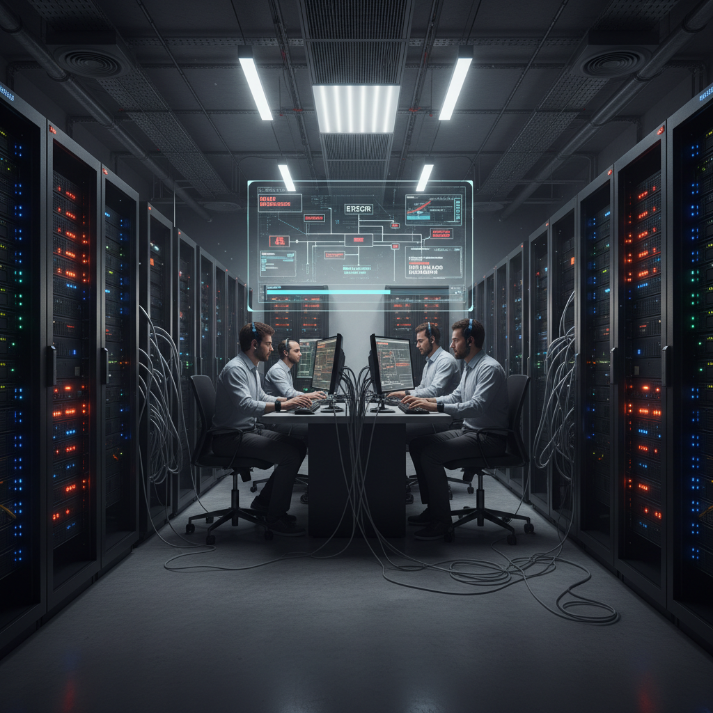 Image: Stark image of a dark server room with warning lights. Alt text: Server outage during enterprise email migration.