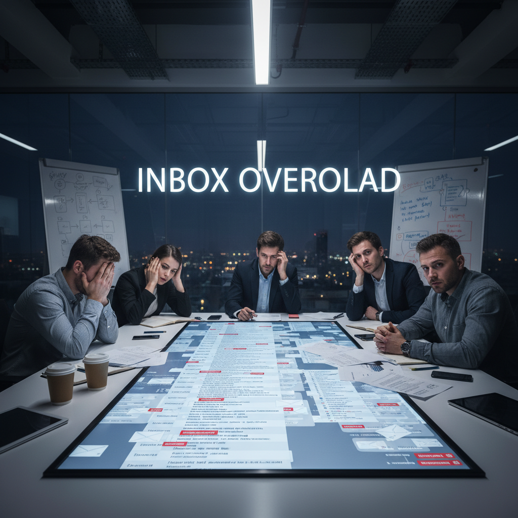 Image: Gritty close-up of overflowing inboxes projected on a wall in a tense meeting room. Alt text: Stressed team facing massive digital inboxes.