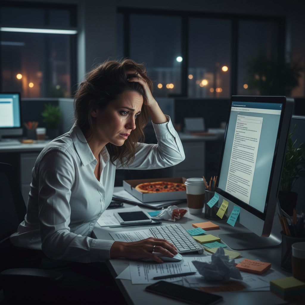 Alt: Person hesitating before sending a critical email reply, office background, moody lighting, email reply anxiety