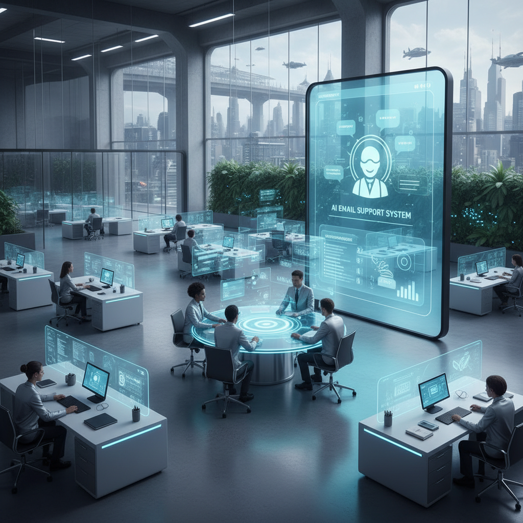 Alt text: Diverse professionals collaborating with an AI teammate via email in a modern office scene, visualizing cross-departmental email support.