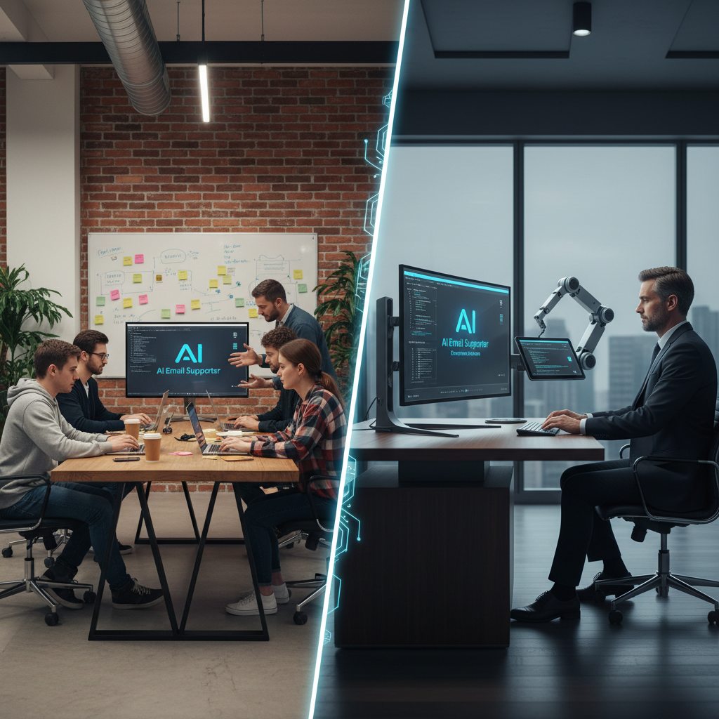 Alt text: Startup and corporate teams leveraging AI email supporters in contrasting environments, highlighting flexible adoption.