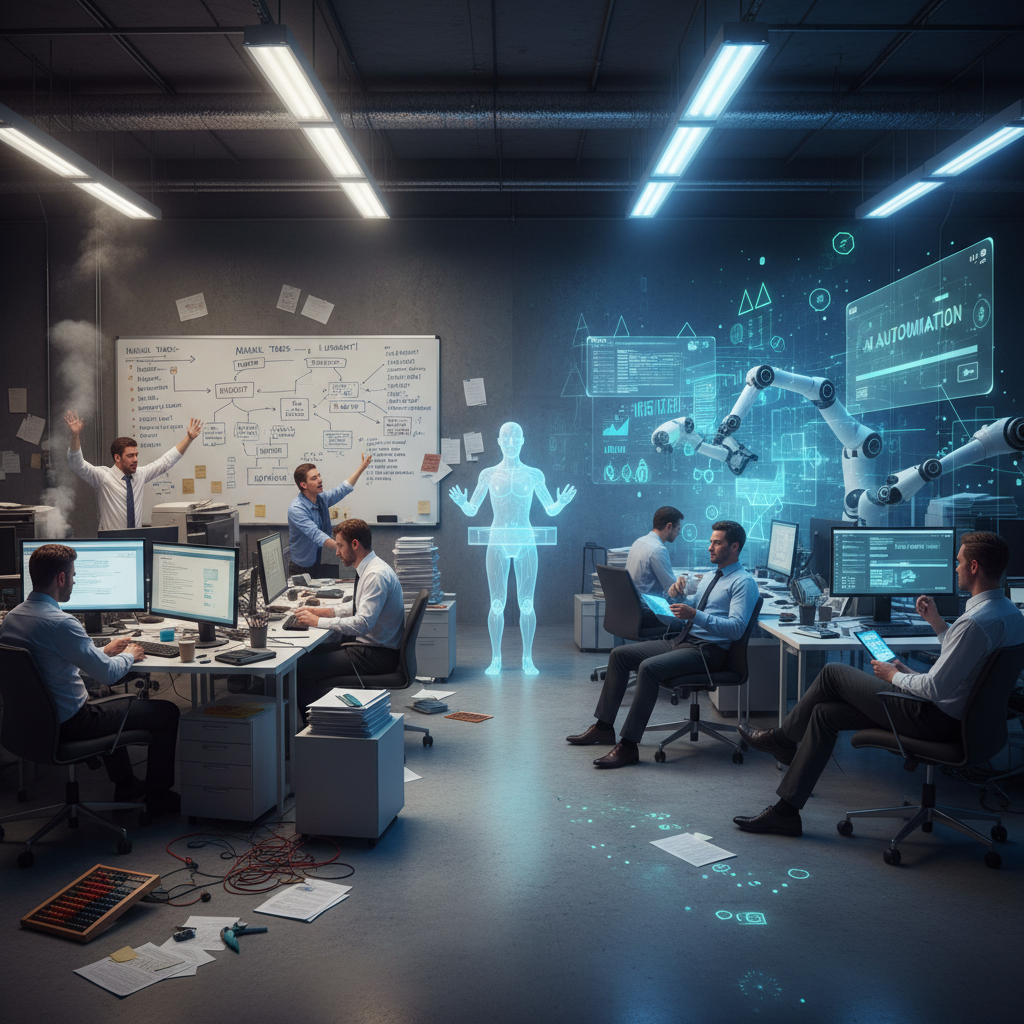 Dramatic visualization of the divide: chaos without automation versus calm, focused productivity when tasks are managed by AI.