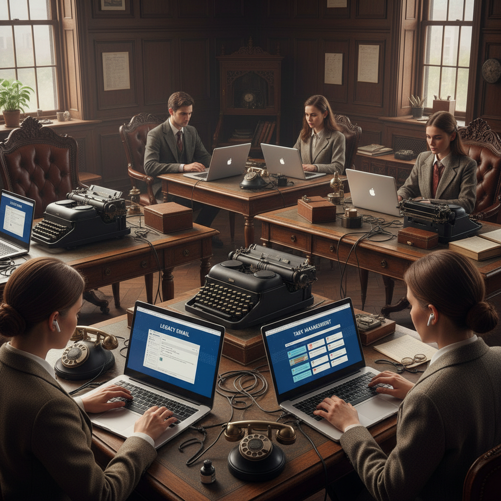 Old office desk meets new tech—email’s lasting grip.