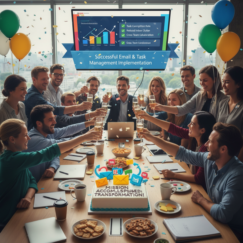Enterprise team celebrating productive collaboration with AI-powered email task management solution.