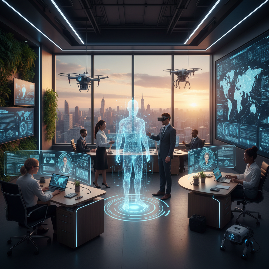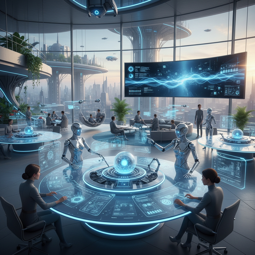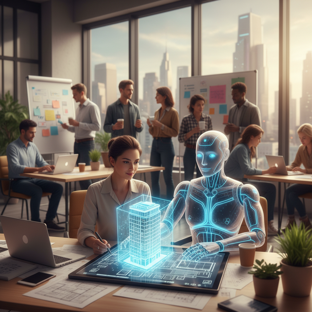 Alt text: Modern office with human and digital coworkers collaborating, symbolizing employee service evolution in the workplace