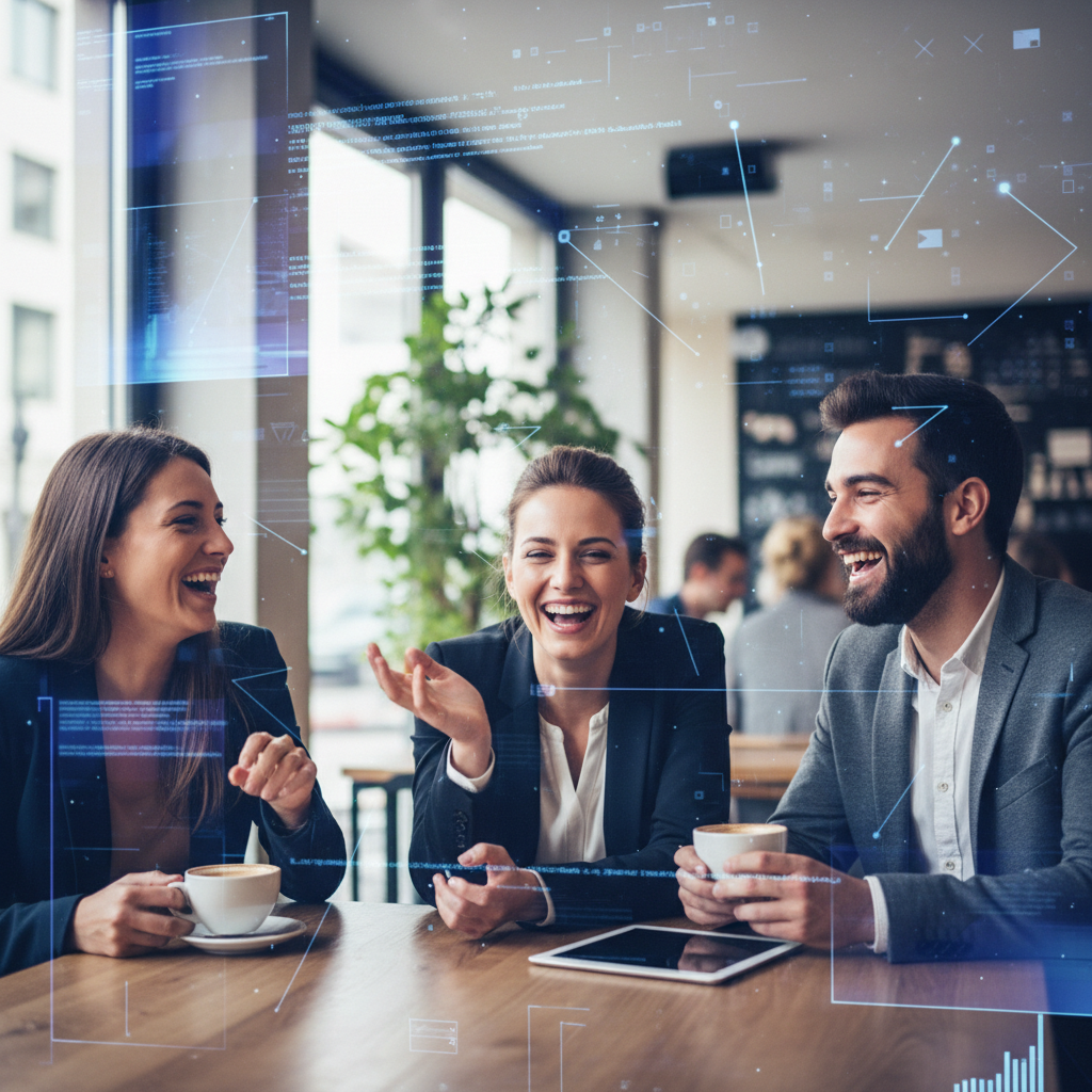 Alt text: Colleagues sharing a laugh over coffee with digital overlay, highlighting the human side of employee service