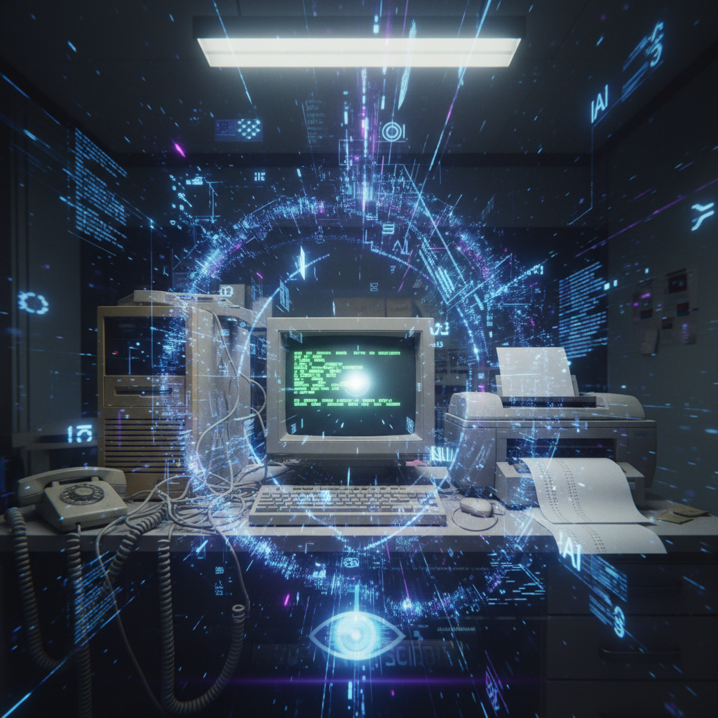 Alt text: Outdated office technology clashing with modern AI interface, symbolizing the legacy gap in employee service
