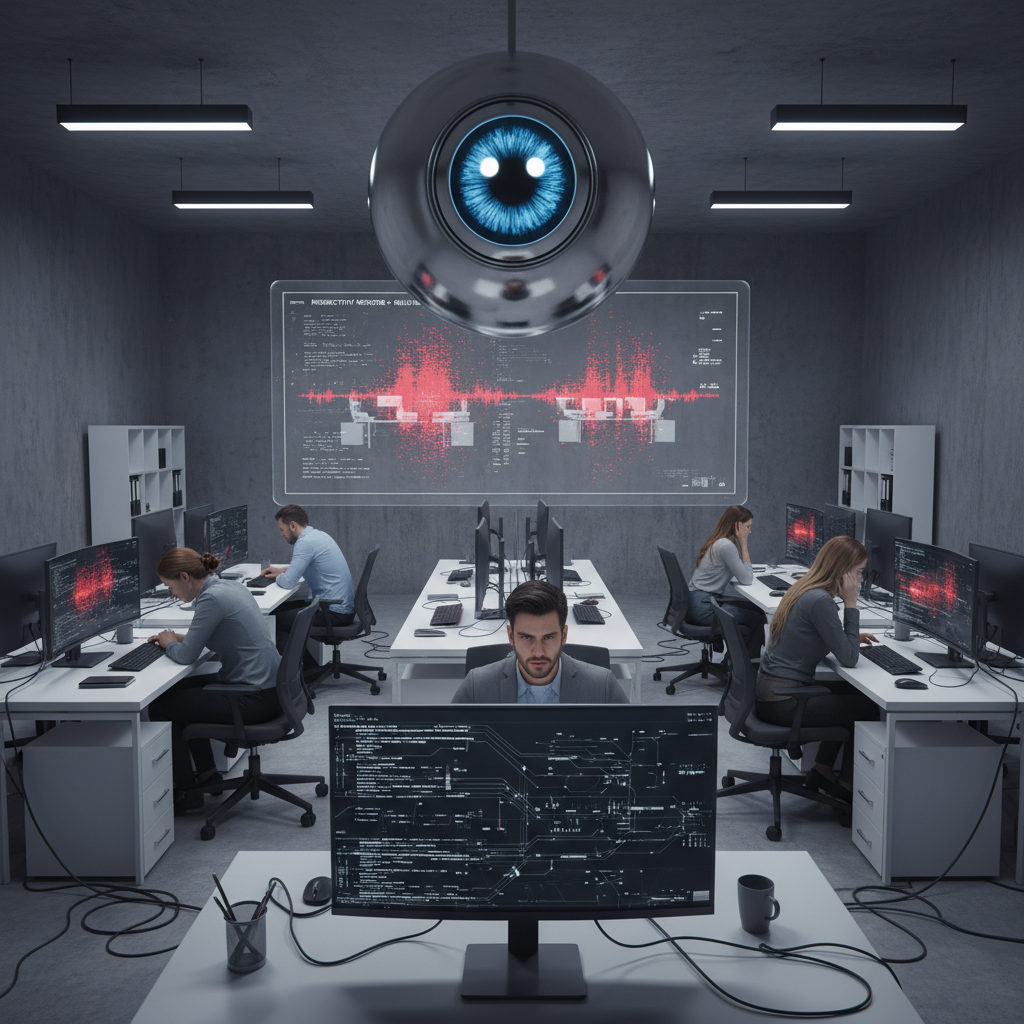 Photo: Digital eye projected over an open-plan office, symbolizing AI surveillance and the resulting employee unease.