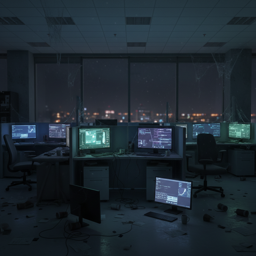 Photo: Empty office chairs and abandoned dashboards flickering on screens—a somber symbol of failed AI BI projects.